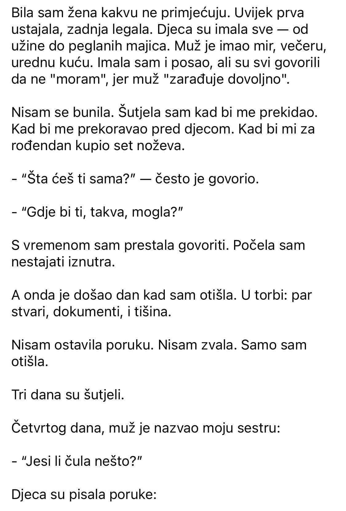 Bila sam žena kakvu ne primjećuju. Uvijek prva ustajala, zadnja legala. Djeca su imala sve — od užine do peglanih majica. Muž je imao mir, večeru, urednu kuću. Imala sam i posao, ali su svi govorili da ne “moram”, jer muž “zarađuje dovoljno”.