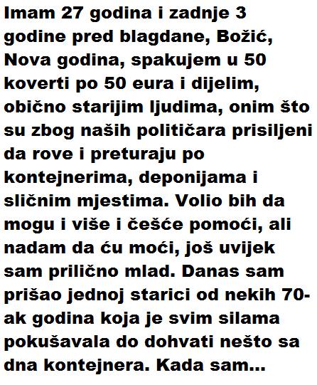 Imam 27 godina i zadnje 3 godine pred blagdane, Božić, Nova godina, spakujem u 50 koverti po 50 eura i dijelim, obično starijim ljudima, onim što su zbog naših političara prisiljeni da rove i preturaju po kontejnerima, deponijama i sličnim mjestima.