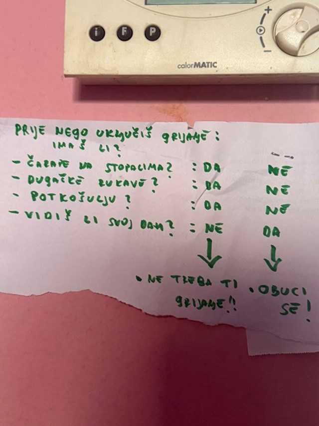 Jedan mladić podijelio je na svojim društvenim mrežama fotku uputa za korištenje grijanja koje mu je ostavila mama prije nego li je otišla na službeno putovanje.