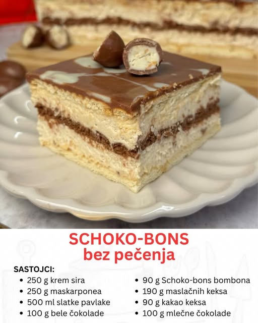 Ovaj desert se izdvaja po intrigantnoj kombinaciji omiljenih Schoko-bons bombona, koji su već sami negovani, uz laganu kremu i hrskavu podlogu. Rezultat je harmonična mešavina različitih tekstura i ukusa koji se neprimetno poboljšavaju.