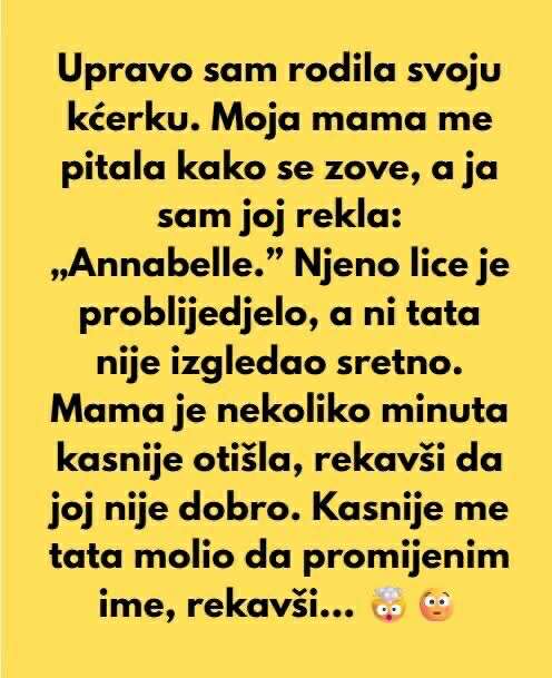 Mama i tata su bili u sobi kad sam rodila, i kada je došlo vrijeme da potpišem rodni list, mama je pitala za ime, a ja sam rekla Annabelle. Njeno lice je problijedjelo, a tata nije izgledao baš sretno, ali je rekao da voli to ime. Mama je nekoliko minuta kasnije otišla, rekavši da joj nije dobro. Rekla je da će doći za nekoliko dana da pomogne s bebom.