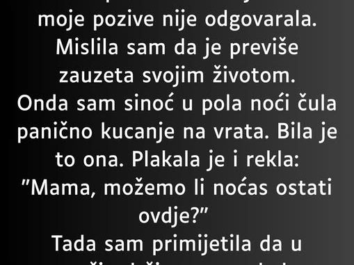 Onda sam sinoć u pola noći čula panično kucanje na vrata. Bila je to ona. Plakala je i rekla: “Mama, možemo li noćas ostati ovdje?”