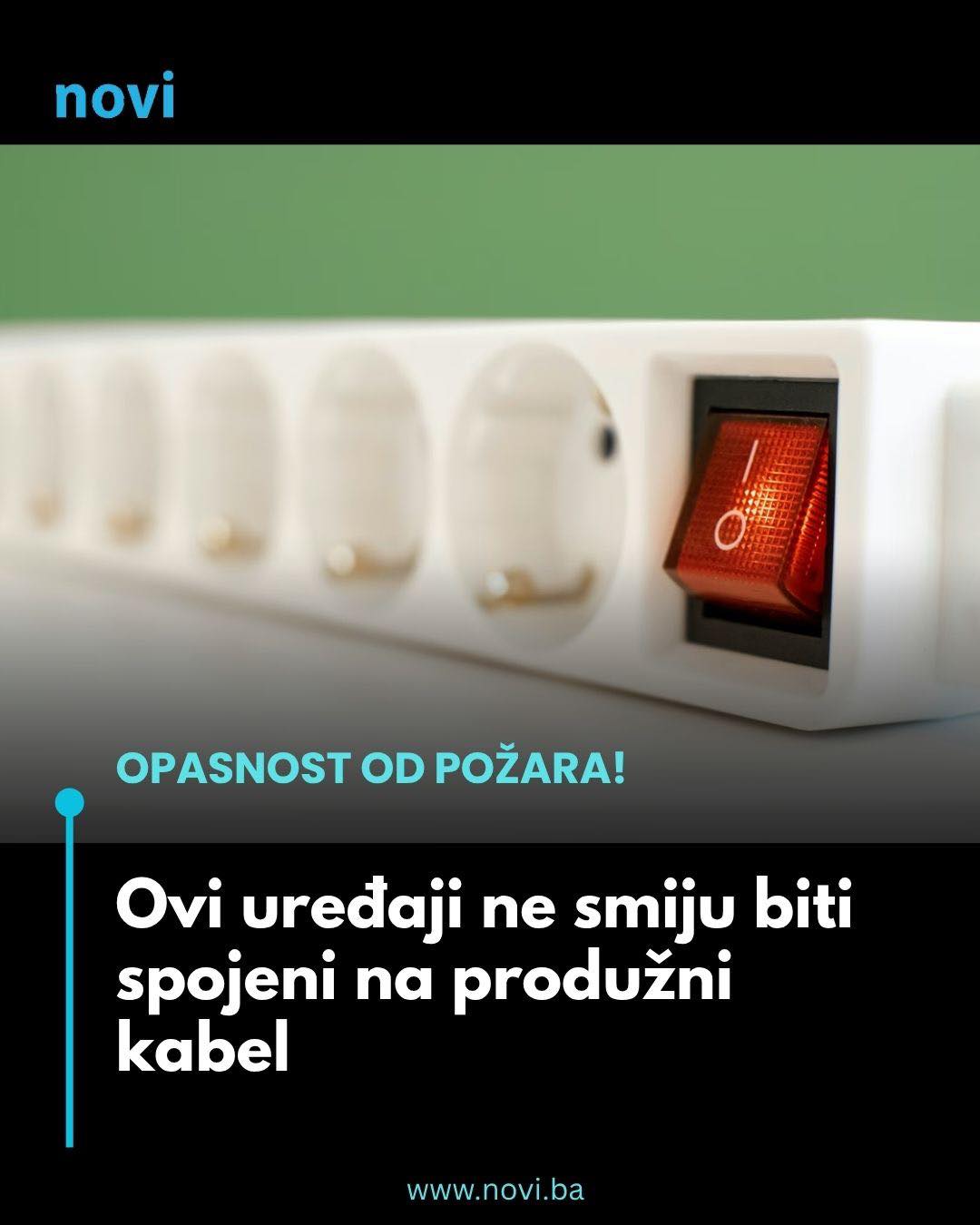 Najčešća i najopasnija greška. Grijalice troše mnogo struje i stvaraju visoku temperaturu koja može pregrijati kabl. Kada se kabl previše zagrije, izolacija se može otopiti, a iskra je dovoljna da izazove požar. Grijalice se moraju priključivati direktno u zidnu utičnicu.