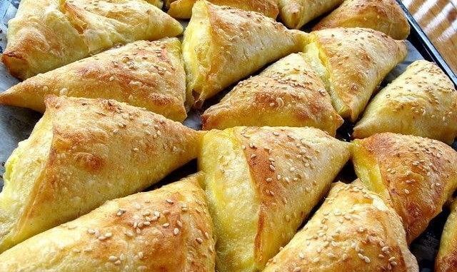 U kut stavite sir i lagano ga preklopite, podsjećajući na uši tegle tijekom izrade. Nastavite sa uvijanjem i preklapanjem kore da dobijete trokutasti oblik.