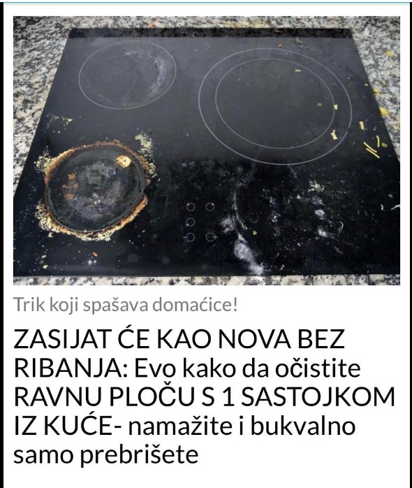 Vjerovali ili ne, prljava ploča za kuhanje može se lako očistiti običnom pastom za zube. Nanesite pastu na čuperke, vatu ili papirne ubruse i nježno obrišite površinu posude, na kraju prebrišite vlažnom krpom. Odličan je za uklanjanje stvrdnutih mrlja od prokuvanog mlijeka, a odličan je i za uklanjanje masnoće od prženja.