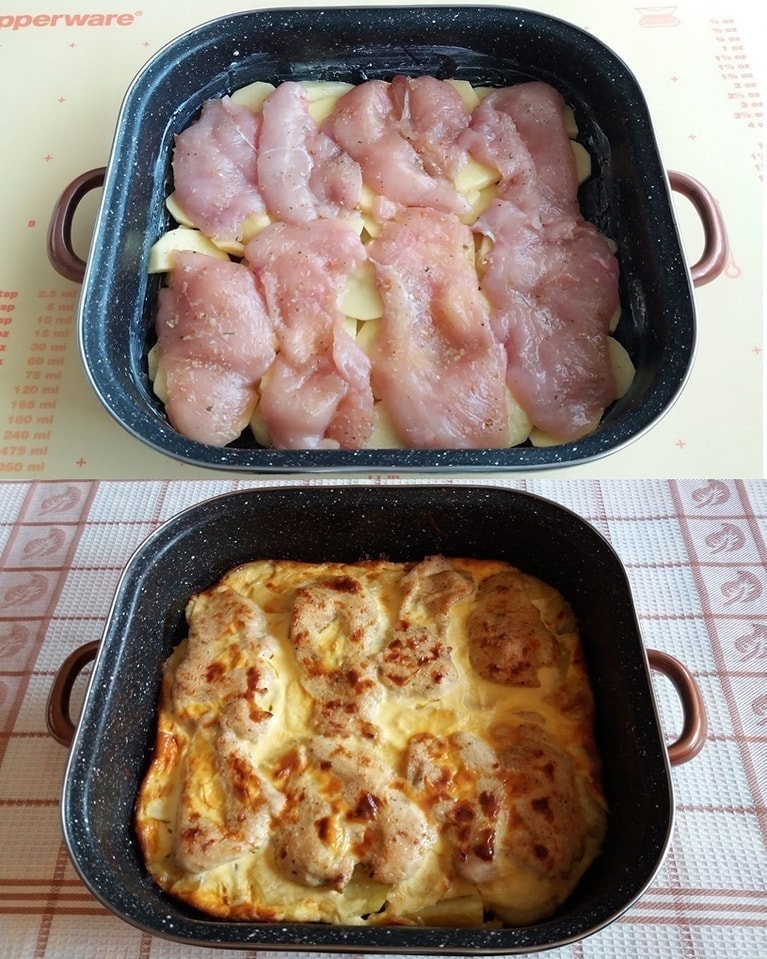 Za ovaj recept potrebno vam je 500 grama pilećeg filea, 700-800 grama krompira, suvi začini, so, biber, 2 jaja, 200 mililitara kiselog vrhnja, 50 mililitara ulja i 20 grama putera.