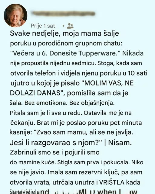 U početku sam mislila da se šali, ali kada nisam dobila odgovor, počela sam da brinem. Moj brat je napisao da je zvao i da se mama ne javlja. Pokušala sam i ja — ali se poziv odmah prekinuo.