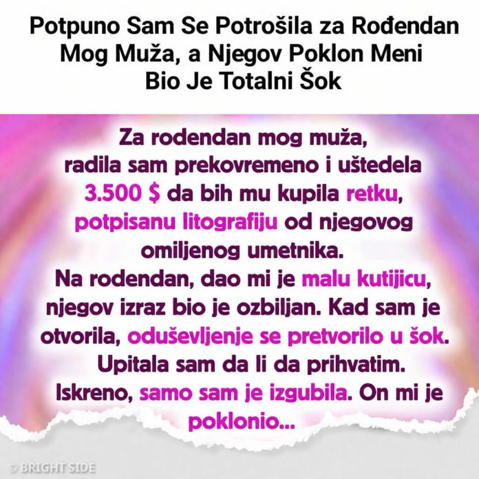 Za rođendan mog muža, radila sam prekovremeno i mesecima štedela da bih mu kupila vrhunsku espresso mašinu o kojoj je maštao. Ali jedan poklon nije bio dovoljan. Takođe sam uštedela 3.500 dolara da mu kupim retku, potpisanu litografiju njegovog omiljenog umetnika.