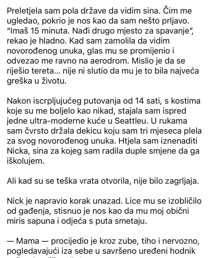 Preletjela sam preko cijele zemlje kako bih vidjela sina. Čim me ugledao, pokrio je nos kao da sam nešto prljavo. „Imaš 15 minuta. Nađi negdje drugdje da ostaneš“, rekao je hladno. Kad sam ga pitala mogu li vidjeti svoje novorođeno unuče, ton mu je postao oštar i odvezao me ravno u zračnu luku. Mislio je da se riješio tereta… ne shvaćajući da je to bila najveća pogreška u njegovom životu.