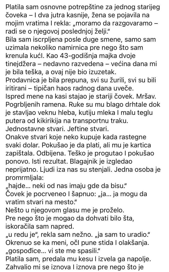 Ova priča nas podseća da svakodnevne situacije mogu biti prilika za istinsku ljudskost. Mala gesta može značiti više nego što mislimo – može promeniti nečiji dan, obnoviti veru u dobrotu i ostaviti trajni utisak.