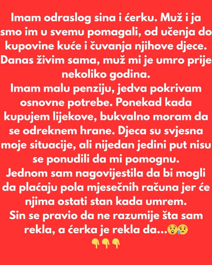 Jednom sam nagovijestila da bi mogli da plaćaju pola mjesečnih računa jer će njima ostati stan kada umrem. Sin se pravio da ne razumije šta sam rekla, a ćerka je rekla da jedva plaća sopstvene troškove.