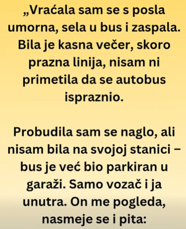 Probudila sam se naglo, ali nisam bila na svojoj stanici – bus je već bio parkiran u garaži. Samo vozač i ja unutra. On me pogleda, nasmeje se i pita: