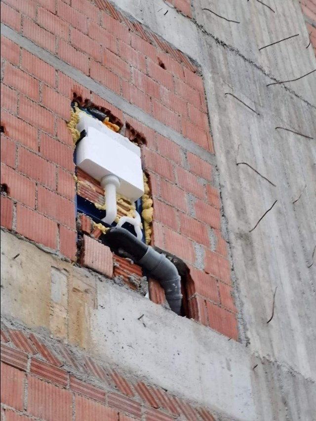 Netko je odlučio da je savršeno mjesto za montažu vodokotlića ni više ni manje nego vanjski zid zgrade. Tako ova instalacija koja prkosi logici i osnovnom osjećaju za intimu sada ponosno pozdravlja prolaznike.