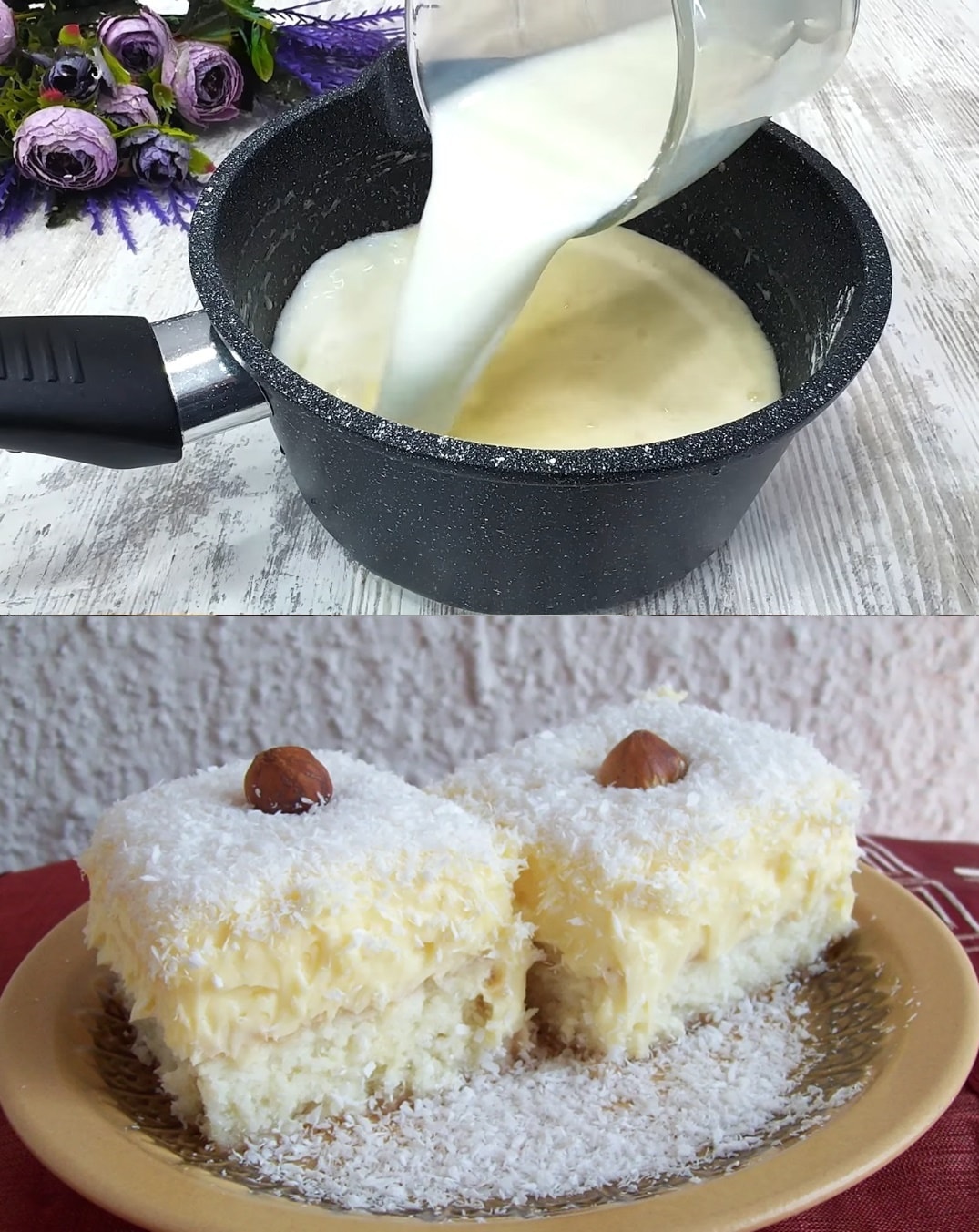 U zdjeli dobro izmiksati 6 žumanjaka, 2 kesice pudinga od vanilije, 4 žlice brašna, 15 žlica šećera i 2 decilitra mlijeka. U posebnom loncu prokuhati 8 decilitara mlijeka; kada zavrije, umiješajte smjesu žumanjaka i kuhajte nekoliko minuta. Ostavite smjesu da se ohladi.