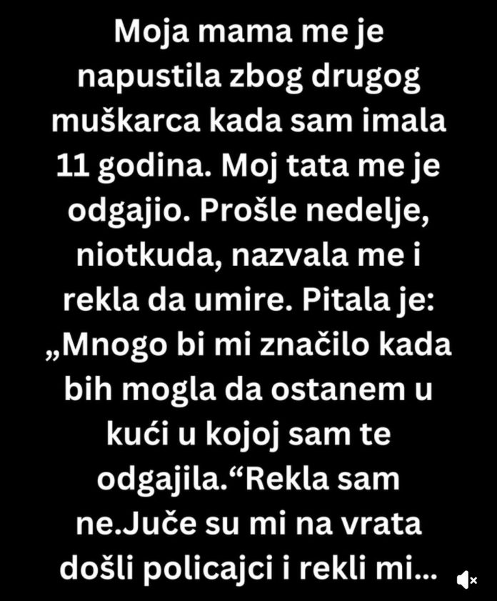 Ta kuća više nije bila njena. To je bila kuća mog oca, kuća u kojoj sam ja odrasla bez nje, kuća u kojoj smo plakali zbog njenog odlaska. Rekla sam joj ne. Bez vike, bez svađe. Samo sam rekla: „Ne mogu.“