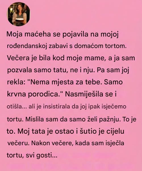 Maćeha se povlači, ostavljajući tortu i tiho predlažući da je mogu podeliti kasnije.