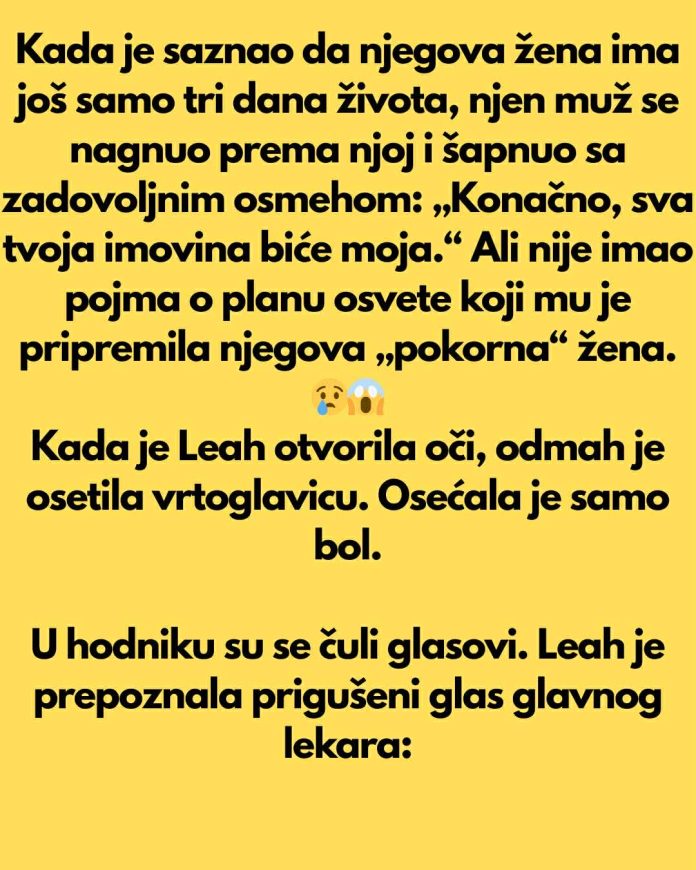 Saznavši da lekari daju njegovoj ženi samo još tri dana života, muž se nagnuo prema njoj i prošaputao sa zadovoljanim 0smehom: „Konačno, sva tvoja imovina biće moja.“ Ali nije ni slutio kakav plan osvete mu je pripremila njegova „pokorna“ žena.