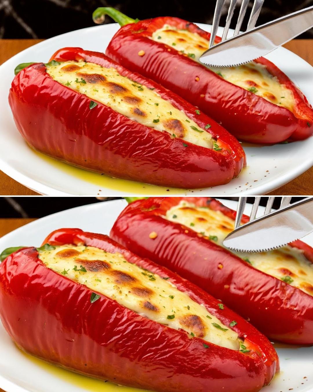 Primamljiva mješavina kremastog cheddara i ljepljive mozzarelle, nadopunjena mirisnim začinskim biljem, rezultira potpuno privlačnim nadjevom, dok se same paprike u pećnici pretvaraju u slatke i mekane zalogaje. Uz hrskavu salatu od kupusa i glatki umak od jogurta, ovo jelo impresivnog izgleda uz minimalan trud za pripremu, što ga čini idealnim i za ležerne večere tijekom tjedna i za druženja s gostima.