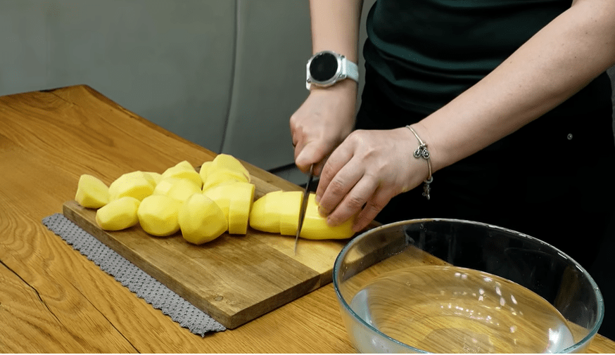 Počnite kuhanjem nasjeckanog krompira dok ne omekša. Ocijedite vodu i izgnječite krompir viljuškom dok ne postane glatka.
