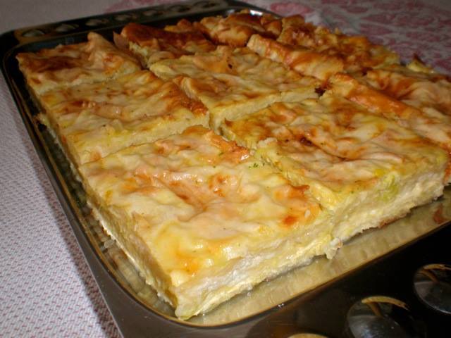 Prelijte mješavinom kiselog vrhnja i jaja, narežite na kocke pomoću oštrog noža da se rasporedi preljev i pecite oko pola sata na 180 stepeni dok ne porumeni.