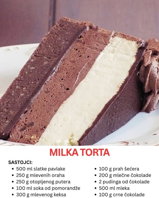 Krema od mliječne čokolade – suština Milka torte. Za izradu ove kreme potrebni su sljedeći sastojci: 200 grama mliječne čokolade, 2 vrećice čokoladnog pudinga, 8 žlica šećera u prahu, 500 mililitara mlijeka, 2 jaja, 250 mililitara slatkog vrhnja, 2 vrećice kremfixa, 1 vrećica želatine i malo ruma po ukusu.