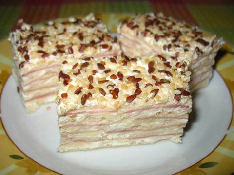 Šunku podelimo na četiri dela, kako kasnije ne bismo imali problem…dole puno, gore ništa . Na premazanu oblatnu, pospemo narendani trapist, pa stavimo red šunke i onda, tankim slojem, premažemo šunku filom kako bi se uhvatila za sledeću oblatnu.