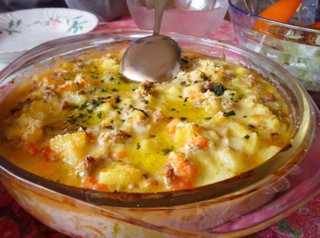 U vatrostalnu posudu ( ili po želji neku drugu koja može u pećnicu) staviti ocijeđene krumpire i mrkvu, dodati meso s porilukom te sve preliti bijelim umakom. Dobro promiješati, na vrh staviti nekoliko komadića maslaca, posipati isjeckanim peršinom i ribanim parmezanom.