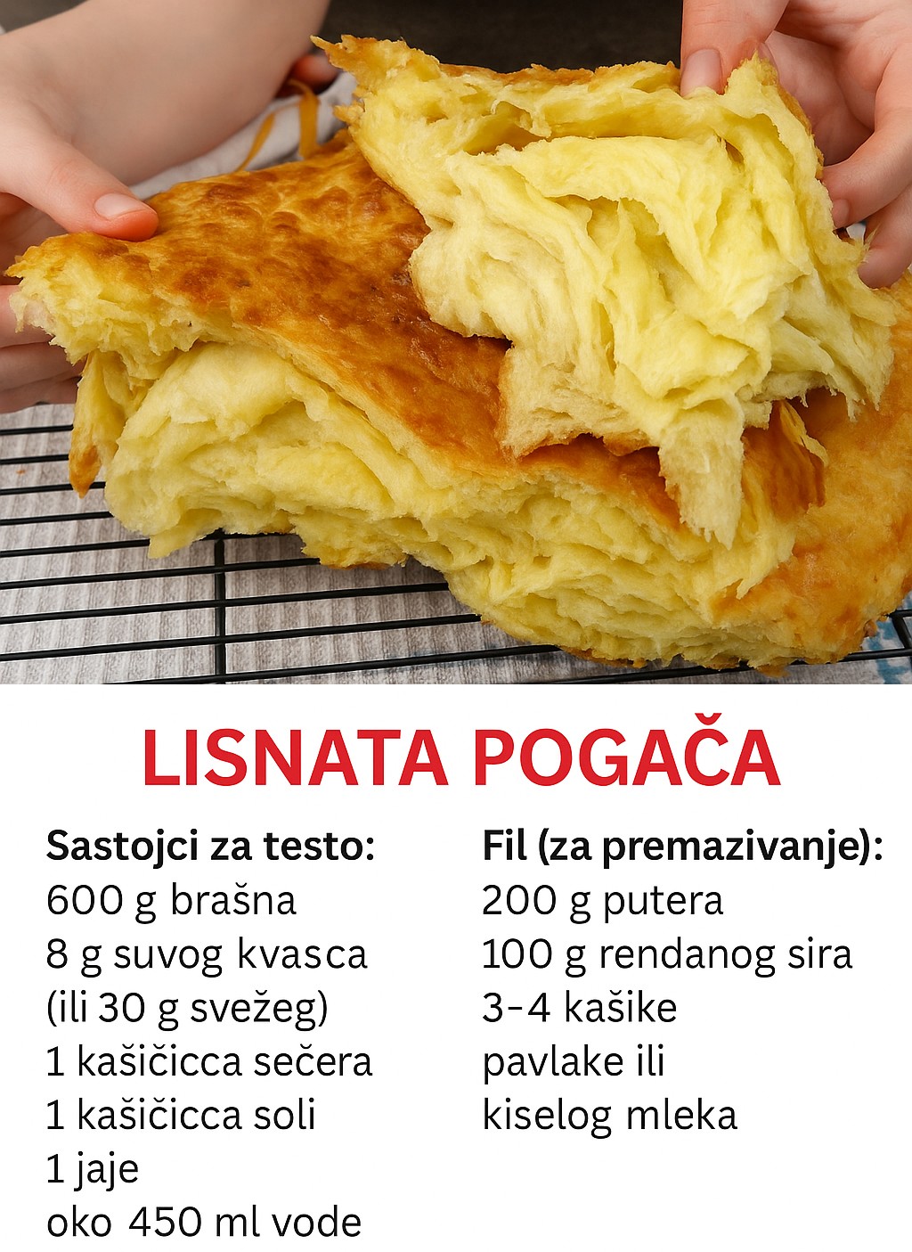 Za fil, moderni recept koristi kombinaciju maslaca, rendanog sira i pavlake ili kiselog mleka, što zajedno kreira bogat premaz koji se fino upija u slojeve pogače tokom pečenja.