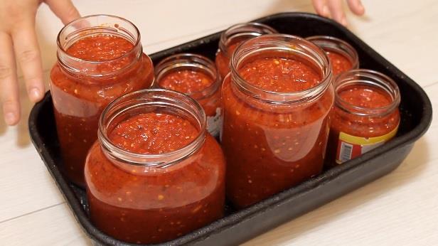 Sve zajedno samleti pa dodati paradajzu. Dobro izmešati i ostaviti da se kuva na srednjoj vatri uz mešanje i povremeno smanjivanje vatre da jako ne prska. U videu se sve zajedno kuvalo tačno 2h. Posle 1h i 40 minuta tegle i poklopce koje ste pripremili staviti u HLADNU rernu pa je uključiti na 120 stepeni da se zagreje. Kada se zagreje držati tegle 10 minuta , pa pre vadjenja tegli ljutenici dodati peršunov list i mešati dok se ne sjedini sa ljutenicom, ugasiti vatru i skloniti, a odmah zatim i tegle izvaditi. Ljutenici dodati konzervans ukolik ododajete, dobro izmešati i puniti vruće tegle. Napunjene tegle vratiti u rernu na 100 stepeni nekih 30 minuta, a zatim isključiti rernu i ostaviti da se tegle i rerna hlade zajedno. Kada su se tegle ohladile da ih možete uhvatiti rukom prekriti svaku celofanom, staviti gumicu pa popklopac i odložiti na tamno i suvo mesto.