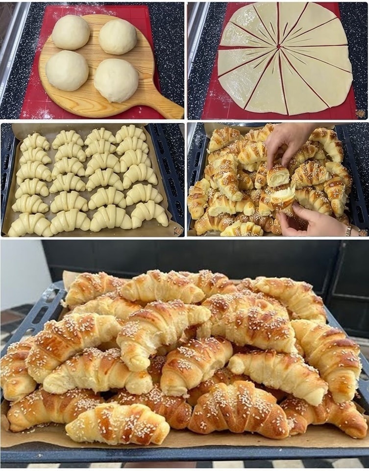 Od tijesta oblikujte kuglice, pokrijte ih i ostavite da odstoje 5 minuta. Zatim razvaljajte tijesto, premažite ga otopljenim maslacem i narežite na trokute. Napravite mali rez u svakom trokutu od uskog do šireg kraja (pogledajte sliku). Zarolati trokutiće. Složite ih na pleh obložen papirom za pečenje i ostavite da odstoje 30 minuta.