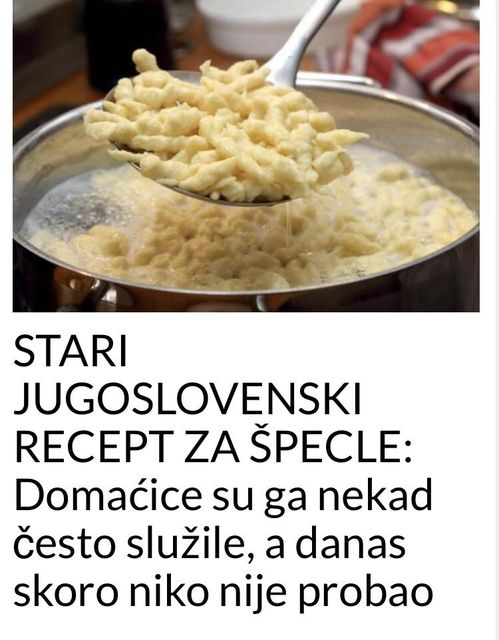 Špeclesu tradicionalno njemačko jelo koje se često spremalo u Jugoslaviji. One mijenjaju testeninu i mogu da se služe na najrazličitije načine, a priprema je toliko jednostavna, kao što su i sastojci jeftini. Podsjeća na pravljenje knedli za supu, a mogu da se služe kao zamena za špagete, kao prilog uz meso sa umakom, uz gulaš, sa sirom… Ali, postoji i slatka varijanta sa ovim tijestom, pa možete da je služite sa makom, orasima, čokoladom… Jugoslovenske domaćice su znale šta valja i često se ovo jelo nalazilo na trpezama.
