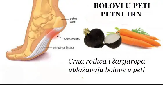 - Narendati manju šargarepu na sitno rende, staviti je na celofan, priviti na bolnu petu i ostaviti da deluje tokom noći. Ponavljati postupak najmanje 10 dana.