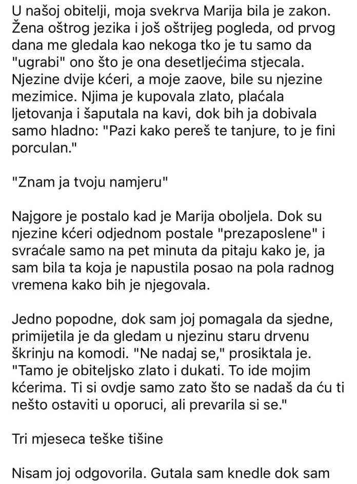U našoj obitelji, moja svekrva Marija bila je zakon. Žena oštrog jezika i još oštrijeg pogleda, od prvog dana me gledala kao nekoga tko je tu samo da “ugrabi” ono što je ona desetljećima stjecala. Njezine dvije kćeri, a moje zaove, bile su njezine mezimice. Njima je kupovala zlato, plaćala ljetovanja i šaputala na kavi, dok bih ja dobivala samo hladno: “Pazi kako pereš te tanjure, to je fini porculan.” “Znam ja tvoju namjeru” Najgore je postalo kad je Marija oboljela. Dok su njezine kćeri odjednom postale “prezaposlene” i svraćale samo na pet minuta da pitaju kako je, ja sam bila ta koja je napustila posao na pola radnog vremena kako bih je njegovala.