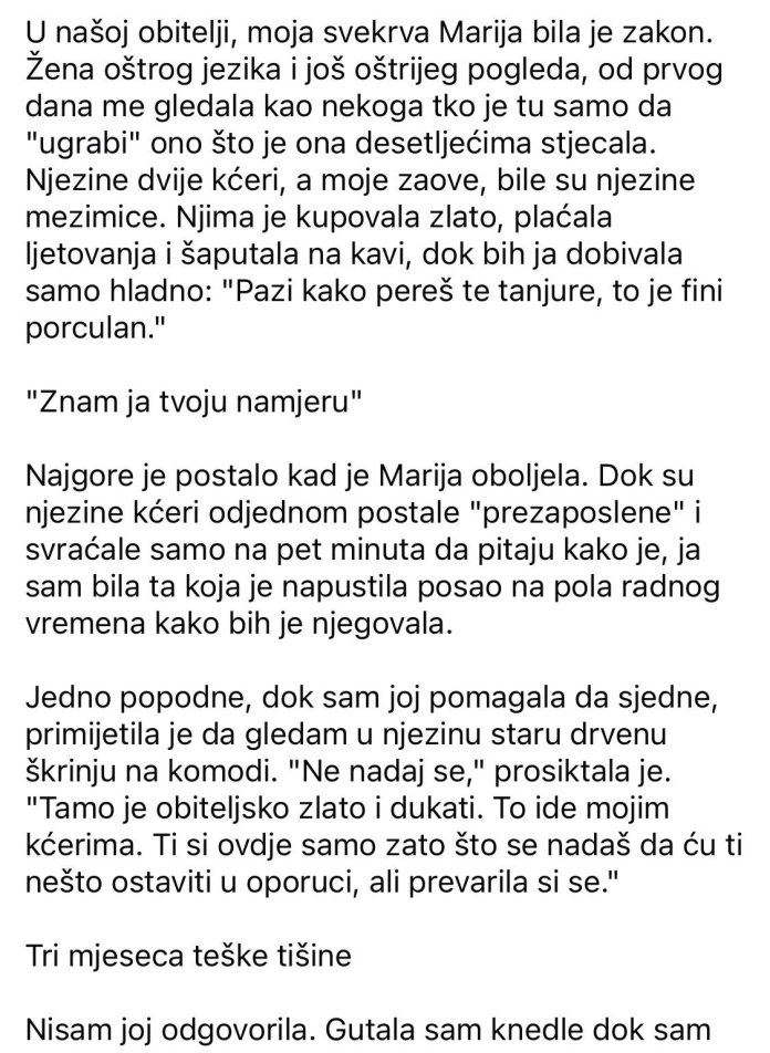 U našoj obitelji, moja svekrva Marija bila je zakon. Žena oštrog jezika i još oštrijeg pogleda, od prvog dana me gledala kao nekoga tko je tu samo da “ugrabi” ono što je ona desetljećima stjecala. Njezine dvije kćeri, a moje zaove, bile su njezine mezimice. Njima je kupovala zlato, plaćala ljetovanja i šaputala na kavi, dok bih ja dobivala samo hladno: “Pazi kako pereš te tanjure, to je fini porculan.” “Znam ja tvoju namjeru” Najgore je postalo kad je Marija oboljela. Dok su njezine kćeri odjednom postale “prezaposlene” i svraćale samo na pet minuta da pitaju kako je, ja sam bila ta koja je napustila posao na pola radnog vremena kako bih je njegovala.