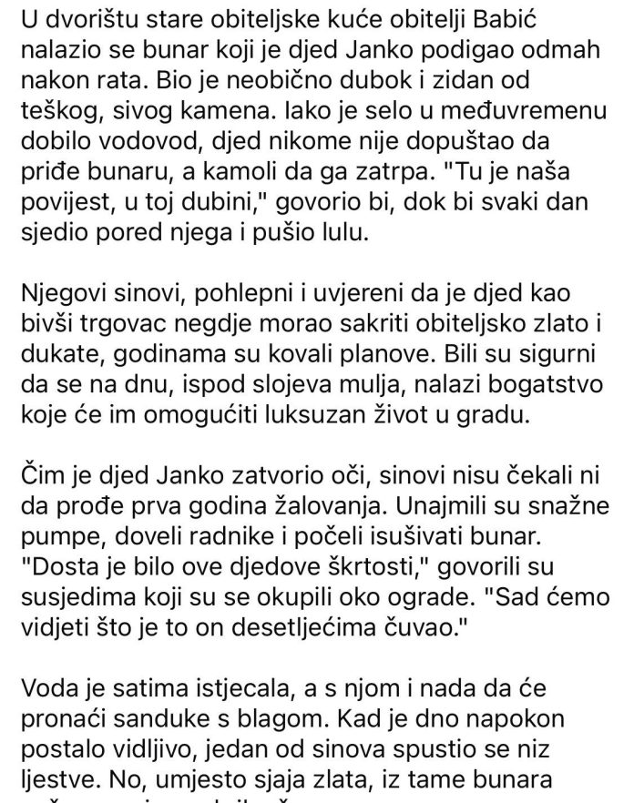 Sinovi su stajali u blatu, držeći u rukama stare slike na kojima su oni sami kao djeca, nasmijani ispred onih istih kreveta. Sramota je bila teža od svakog kamena u tom bunaru. Shvatili su da je djed cijeli život šutio o svojoj žrtvi jer nije želio da se osjećaju dužnima, a oni su tu istu tišinu protumačili kao škrtost. Bunar je ostao prazan, baš kao i njihova srca tog dana. Prodali su imanje, ali novac im nikada nije donio mir. Svaki put kad bi čuli zvuk vode, sjetili bi se dna bunara i onoga što su tamo izgubili – ne zlato, nego dostojanstvo koje se ne može kupiti.