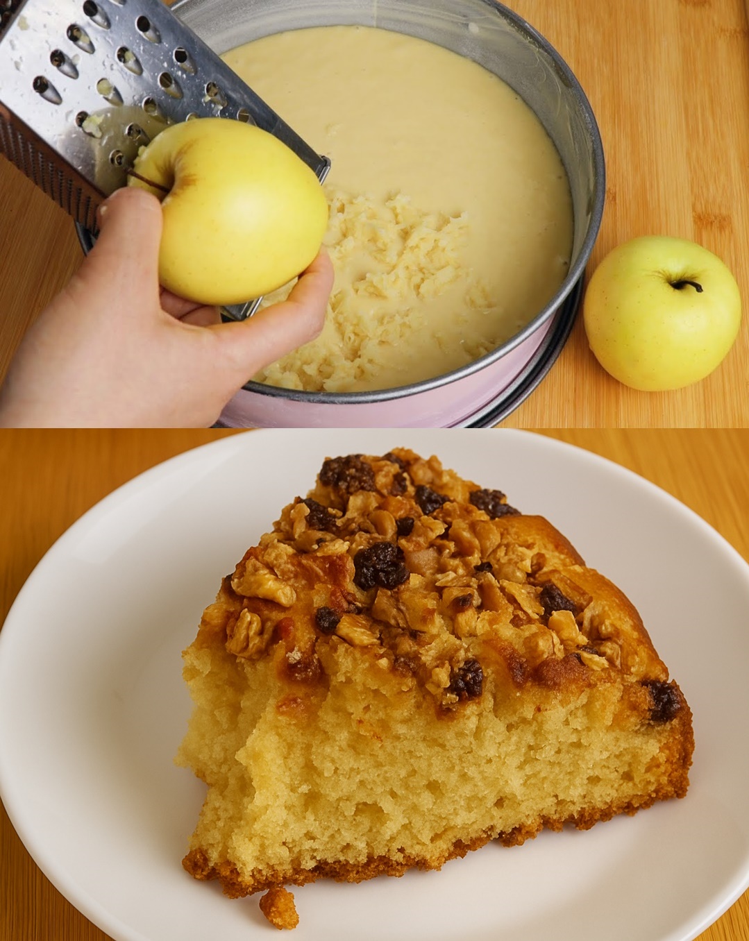 Pripremite pleh za pečenje tako što ćete ga podmazati puterom i lagano posuti brašnom. Ravnomerno rasporedite smesu po plehu, a zatim sloj rendanih jabuka. Zatim, preko jabuka, dodajte orahe i suvo grožđe. Pecite kolač na 180 stepeni tokom 35 do 40 minuta. Kada je kolač potpuno pečen, ukrasite ga tečnim sirupom.
