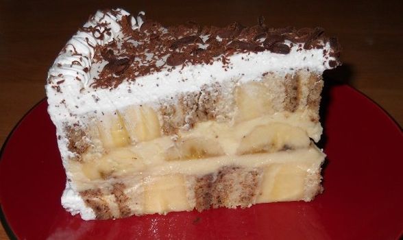 Pečenu koru premazati polovinom I fila, Redamo 2 banane i uvijemo u rolat. Na isti način uvijemo i drugi rolat.Siječemo rolate i poredamo ih umjesto dna kalupa za tortu.