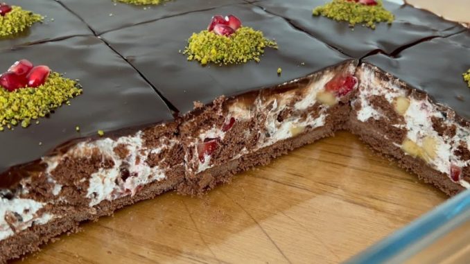 * Na dno pleha (najbolje je koristiti pleh za pečenje ili posudu veličine 20×30 cm) stavite 1,5 paketa kakaovih biskvita, pazeći da pokriju celo dno.