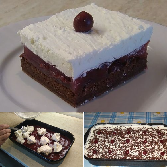 Izlijemo prethodno napravljenu smjesu s višnjama i ravnomjerno rasporedimo.
