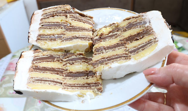 Uzani pleh obložiti folijom. Skuvati puding jedan i drugi po uputstvu posebno. Mazati na svaki keks prvo puding od vanile i slagati uz zid pleha po dužini, pa onda preko njega od čokolade i tako redom dok se ne napuni pleh.