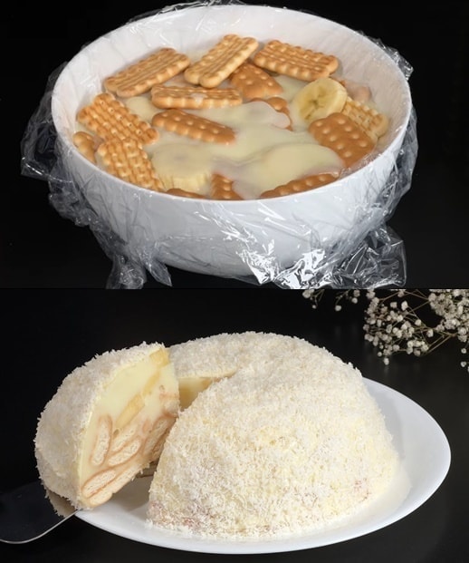 Obložite disk providnom folijom i sipajte malo fila. Zatim rasporedite zgnječene kekse i nekoliko kriški banane. Ponovo sipajte fil, pa kekse i banane…tako ređajte dok se ne iskoriste svi sastojci. Pokrijte prozirnom folijom i ostavite da se hladi oko 12 sati.