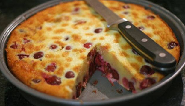 Sipajte pripremljeni biskvit, rasporedite ocijedjene visnje ili neko drugo voce i pecite oko 35 minuta na 180 stupnjeva ili dok ne postane zlatno zute boje.