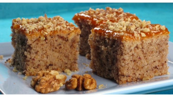 : Pečeni kolač premazati džemom od marelica i posuti nasjeckanim orasima.