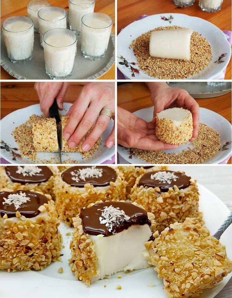 Nakon što se ohladi, izvadite puding iz čaša i prerežite ga na pola. Polovice uvaljajte u nasjeckani kikiriki i po vrhu prelijte otopljenom čokoladom. Završite posipanjem kokosa po čokoladi.