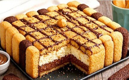 Lagano umoči kakao piškote u hladno mlijeko i složite ih na dno kalupa za tortu sa uklonjivim obodom (veličine 24 cm x 24 cm). Složite ih čvrsto, jedan do drugog. Zatim obložite i stranice kalupa, naizmjenično slažući dva klasična i jedan kakao piškotu, tako da dobijete šahovsku šaru.