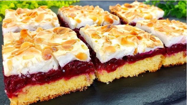 – Posuti listićima badema i peći još 20 minuta na 180°C, dok biskvit ne postane zlatno smeđi.