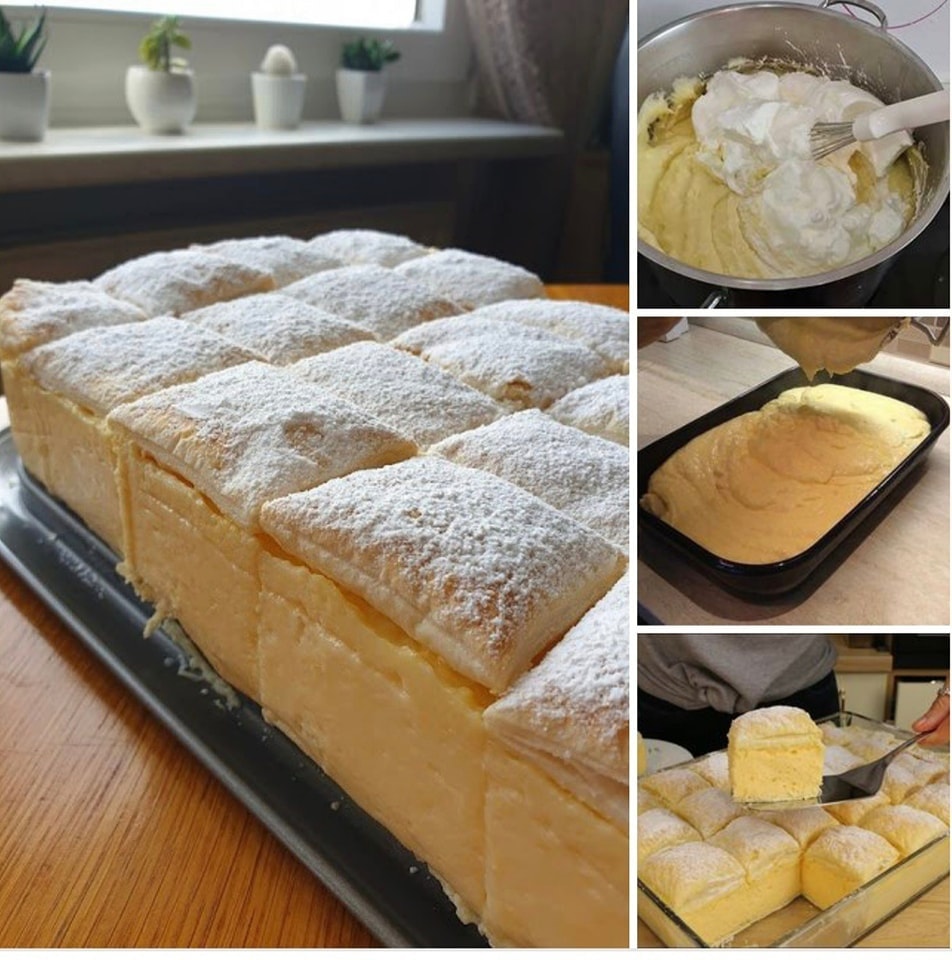 Umutiti 6 belanca i 10 kašika šećera u čvrst sneg, pa lagano pomešati sa malo ohlađenom kremom i filovati između dve kriške u dublji pleh, gornju već iseći na kockice radi lakšeg sečenja.