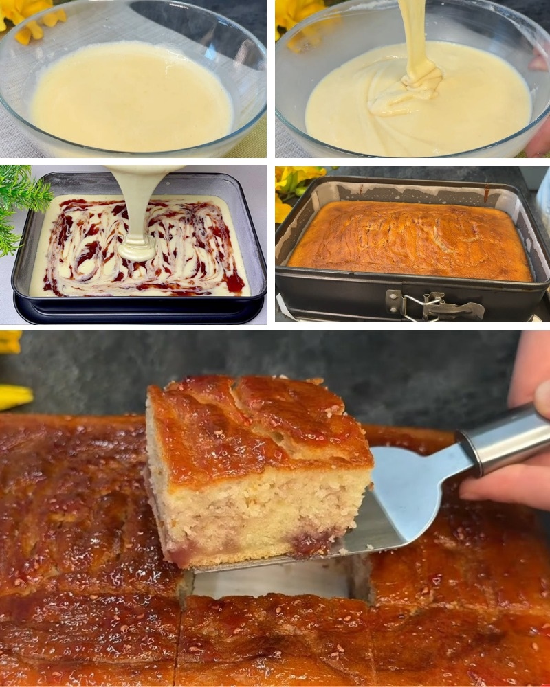 Za pripremu kolača: 8. Prebacite pola tijesta u pripremljeni kalup za pečenje i ravnomjerno ga rasporedite. 9. Pažljivo stavite džem od jagoda na tijesto, pazeći da je ravnomjerno raspoređen uz zadržavanje blagog ruba oko rubova. 10. Preostalo tijesto prelijte preko sloja džema od jagoda, pazeći da se ravnomjerno rasporedi da potpuno prekrije džem.