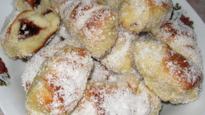U medjuvremenu skuvati sirup: U posudu staviti šećer i vodu i kuvati 4-5 minuta od vremena kad proključa. Pečene kiflice tople uvaljivati u topao sirup (kiflice ne da stoje u sirupu samo provući kroz sirup sa jedne i druge strane) pa posuti kokosom.