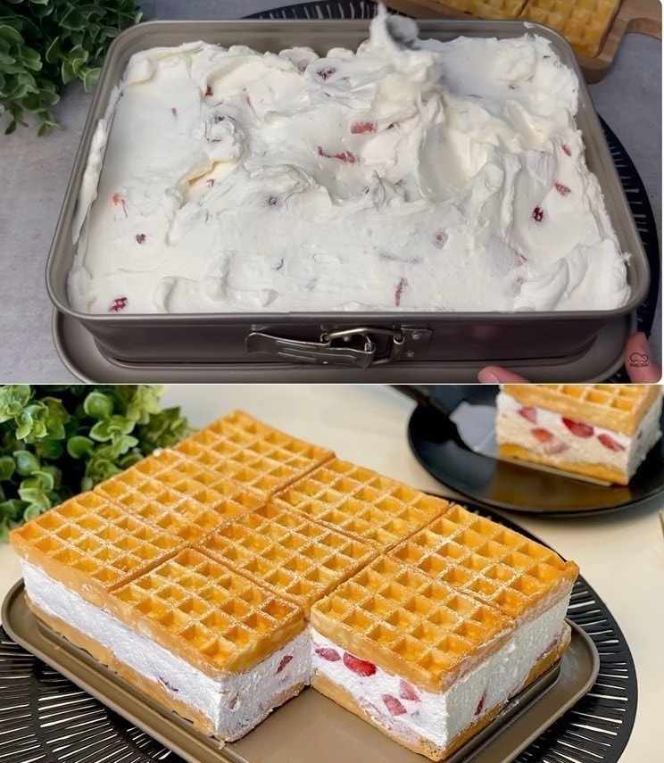 Umutiti slatko vrhnje sa mascarpone sirom. Jagode narežite na kockice i umiješajte u smjesu pa promiješajte da se sjedini. Na podnožje kalupa posložiti vafle (9 komada) pa preko njih izliti smjesu i poravnati.